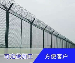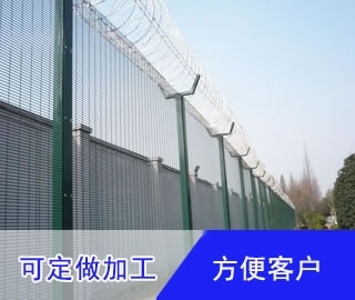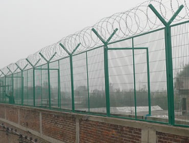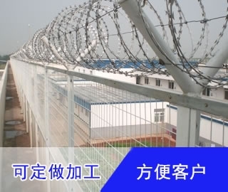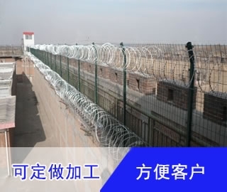 監獄圍欄網又稱為監獄鋼網牆、監獄鐵絲網、監獄隔離柵,主要是采用高強度的刀片刺繩與普通防護網的結合,由V型支架立拄,加強型焊接片網,安全防盜連接件和刀片刺繩組成.刀片刺繩是一種新型防護網,由銳利尖角鍍鋅鋼板或不鏽鋼薄板做刀片,鋼絲做芯線組合而成的防護器材。