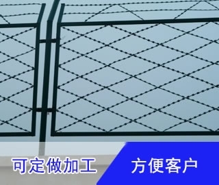 2. 刀片刺繩與圍欄網片組合而成的一種,常用在機場、監獄、看守所、邊防等重安全防護場所,一般采用高強度低碳鋼絲焊接成高強度網片,熱鍍鋅刀片刺繩,Y型矩形鋼立柱組合而成,網片中可帶有V型加強筋,增加護欄的抗衝壓力。